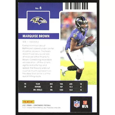 This is a 2021 Panini Contenders Marquise Brown football card. The card is #8 and pictures show condition.