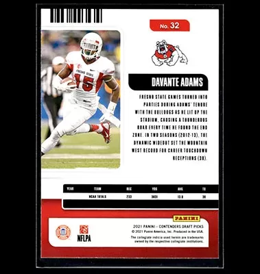 This is a 2021 Panini Contenders Draft Picks Davante Adams football card. The card is #32 and is in NM-MT condition.