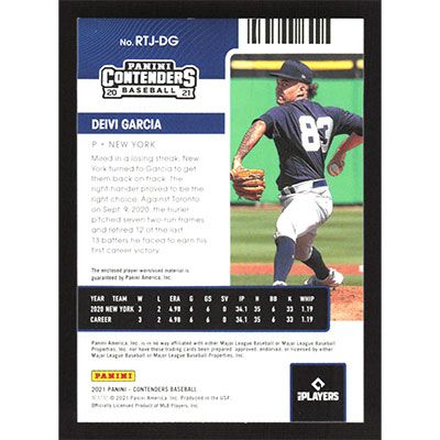 This is a 2021 Panini Contenders Rookie Ticket Jerseys Deivi Garcia Pinstripe baseball card. The card is #RTJ-DG and pictures show condition. Team(s): New York Yankees Rookie Card (RC)