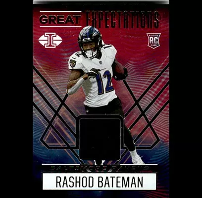 This is a 2021 Panini Illusions Great Expectations Materials Rashod Bateman football card. This card has a piece of authentic jersey embedded into it. The card is #GE-RB and is in NM-MT condition.