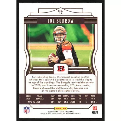 This is a 2021 Panini Legacy Joe Burrow football card. The card is #17 and pictures show condition.
