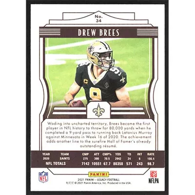 This is a 2021 Panini Legacy Drew Brees football card. The card is #34 and pictures show condition.
