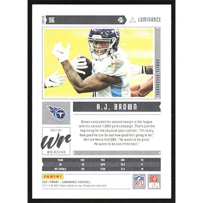This is a 2021 Panini Luminance A.J. Brown football card. The card is #96 and pictures show condition.