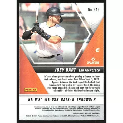 This is a 2021 Panini Mosaic Joey Bart baseball card. The card is #212 and pictures show condition.