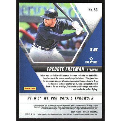 This is a 2021 Panini Mosaic Freddie Freeman baseball card. The card is #53 and pictures show condition.