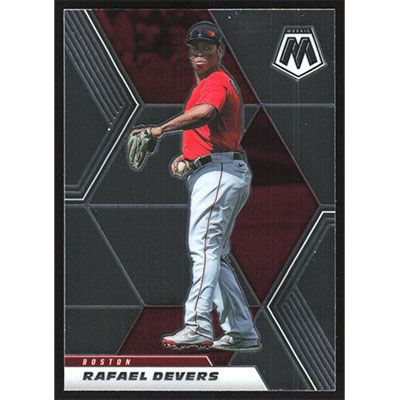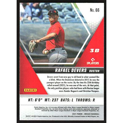 This is a 2021 Panini Mosaic Rafael Devers baseball card. The card is #66 and pictures show condition.
