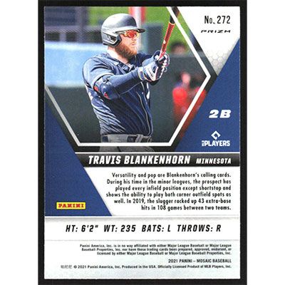 This is a 2021 Panini Mosaic Blue Camo Travis Blankenhorn baseball card. The card is #272 and pictures show condition. Team(s): Minnesota Twins Rookie Card (RC)