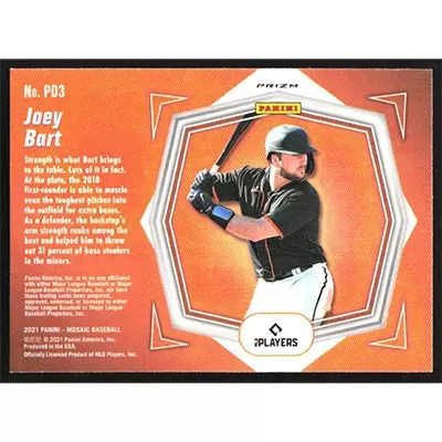 This is a 2021 Panini Mosaic Debuts Green Joey Bart baseball card. The card is #PD3 and pictures show condition.