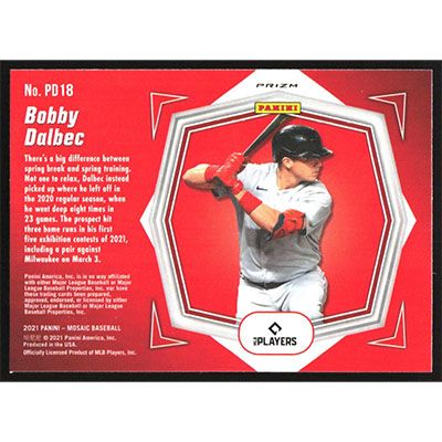 This is a 2021 Panini Mosaic Debuts Mosaic Bobby Dalbec baseball card. The card is #PD18 and pictures show condition. Team(s): Boston Red Sox Rookie Card (RC)