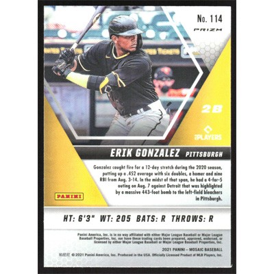 This is a 2021 Panini Mosaic Pink Camo Erik Gonzalez baseball card. The card is #114 and pictures show condition.