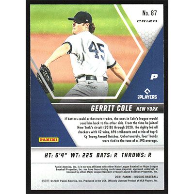 This is a 2021 Panini Mosaic Silver Prizm Gerrit Cole baseball card. The card is #87 and pictures show condition.