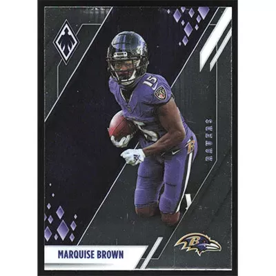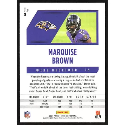 This is a 2021 Panini Phoenix Marquise Brown football card. The card is #9 and pictures show condition.