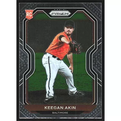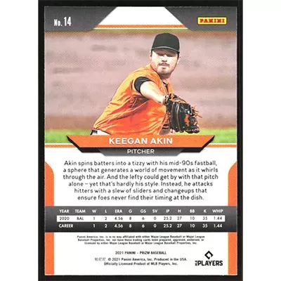 This is a 2021 Panini Prizm Keegan Akin baseball card. The card is #14 and pictures show condition.