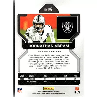 This is a 2021 Panini Prizm Johnathan Abram football card. The card is #182 and is in NM-MT condition.