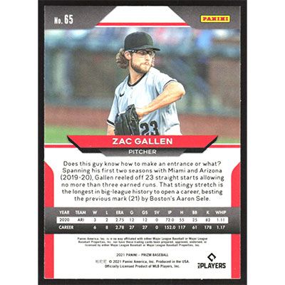 This is a 2021 Panini Prizm Zac Gallen baseball card. The card is #65 and pictures show condition.