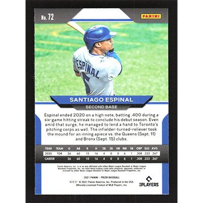 This is a 2021 Panini Prizm Santiago Espinal baseball card. The card is #72 and pictures show condition.