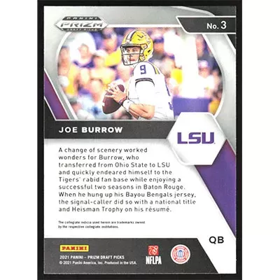 This is a 2021 Panini Prizm Draft Picks Joe Burrow football card. The card is #3 and pictures show condition.