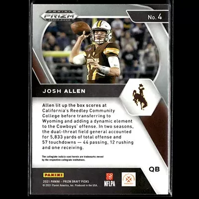 This is a 2021 Panini Prizm Draft Picks Josh Allen football card. The card is #4 and is in NM-MT condition.