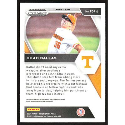 This is a 2021 Panini Prizm Draft Picks Green Pulsar Chad Dallas baseball card. The card is #PDP121 and pictures show condition. Team(s): Tennessee Volunteers