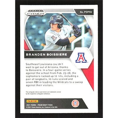 This is a 2021 Panini Prizm Draft Picks Branden Boissiere baseball card. The card is #PDP82 and pictures show condition.
