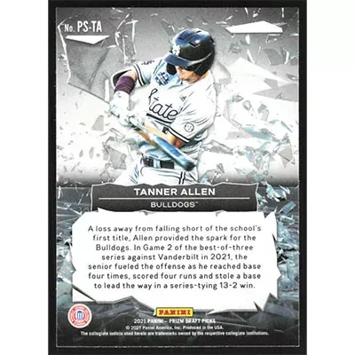 This is a 2021 Panini Prizm Draft Picks Power Surge Tanner Allen baseball card. The card is #PS-TA and pictures show condition. Team(s): Mississippi State Bulldogs