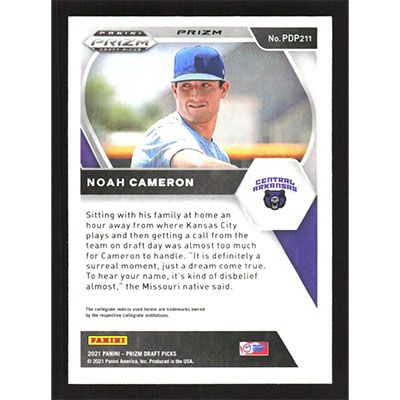 This is a 2021 Panini Prizm Draft Picks Red Velocity Noah Cameron baseball card. The card is #PDP211 and pictures show condition. Team(s): Central Arkansas Bears