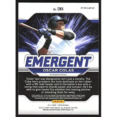 This is a 2021 Panini Prizm Emergent Silver Oscar Colas baseball card. The card is #EM4 and pictures show condition.