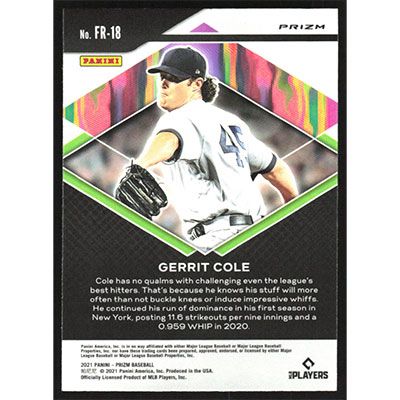 This is a 2021 Panini Prizm Fearless Pink Gerrit Cole baseball card. The card is #FR-18 and pictures show condition.