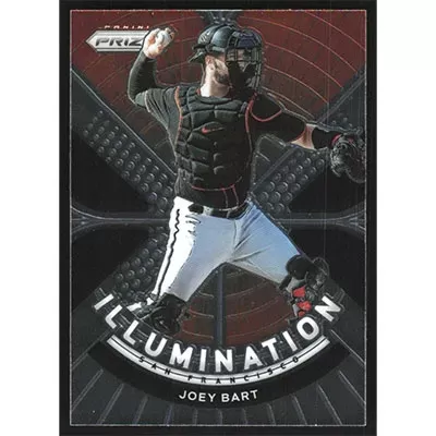 This is a 2021 Panini Prizm Illumination Joey Bart baseball card. The card is #IL-3 and pictures show condition.
