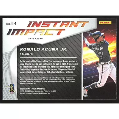This is a 2021 Panini Prizm Instant Impact Silver Ronald Acuña Jr. baseball card. The card is #II-1 and pictures show condition.