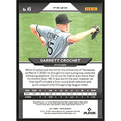 This is a 2021 Panini Prizm Purple Garrett Crochet baseball card. The card is #45 and pictures show condition. Team(s): Chicago White Sox Rookie Card (RC)