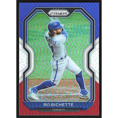 This is a 2021 Panini Prizm Red White and Blue Bo Bichette baseball card. The card is #158 and pictures show condition.