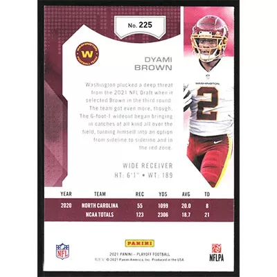 This is a 2021 Playoff Dyami Brown football card. The card is #225 and pictures show condition.