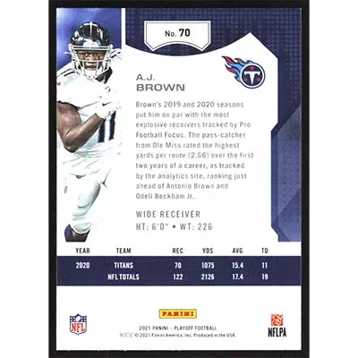 This is a 2021 Playoff Goal Line A.J. Brown football card. The card is #70 and pictures show condition.