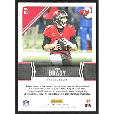 This is a 2021 Score Next Level Stats Tom Brady football card. The card is #NL1 and pictures show condition.