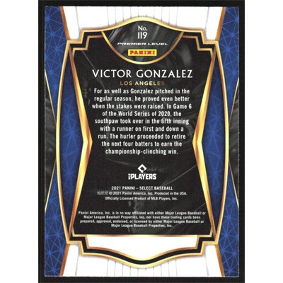 This is a 2021 Select Victor Gonzalez Premier baseball card. The card is #119 and pictures show condition. Team(s): Los Angeles Dodgers Rookie Card (RC)