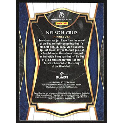 This is a 2021 Select Nelson Cruz Premier baseball card. The card is #172 and pictures show condition.