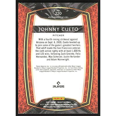 This is a 2021 Select Johnny Cueto Diamond baseball card. The card is #220 and pictures show condition.