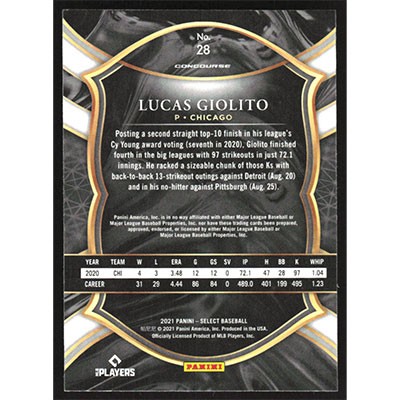 This is a 2021 Select Lucas Giolito baseball card. The card is #28 and pictures show condition.