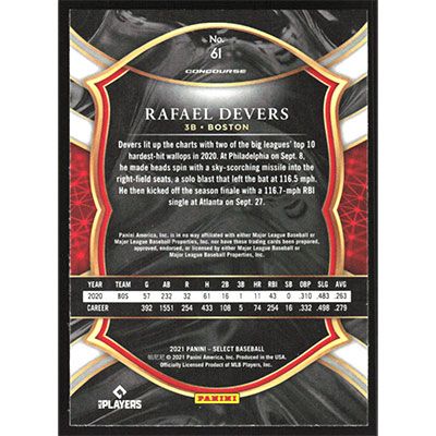 This is a 2021 Select Rafael Devers baseball card. The card is #61 and pictures show condition.