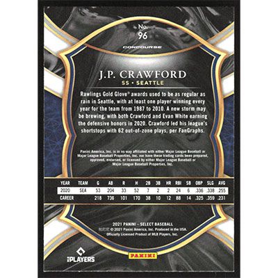 This is a 2021 Select J.P. Crawford baseball card. The card is #96 and pictures show condition.
