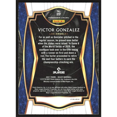 This is a 2021 Select Scope Victor Gonzalez Premier baseball card. The card is #119 and pictures show condition. Team(s): Los Angeles Dodgers Rookie Card (RC)