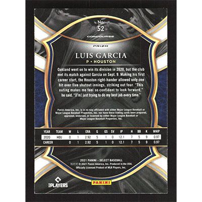 This is a 2021 Select Tri-Color Luis Garcia baseball card. The card is #52 and pictures show condition.