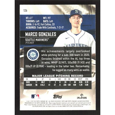 This is a 2021 Stadium Club Marco Gonzales baseball card. The card is #126 and pictures show condition.