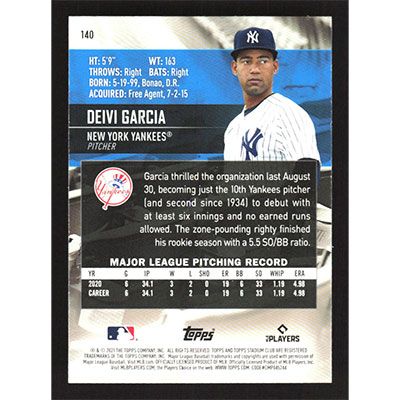 This is a 2021 Stadium Club Deivi Garcia baseball card. The card is #140 and pictures show condition.