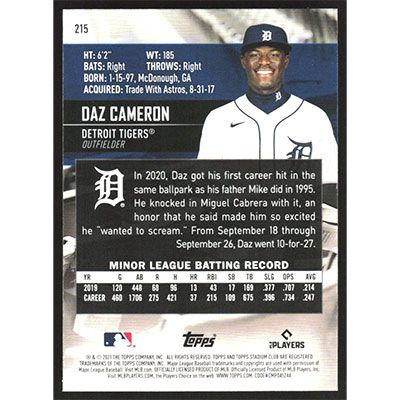 This is a 2021 Stadium Club Daz Cameron baseball card. The card is #215 and pictures show condition.