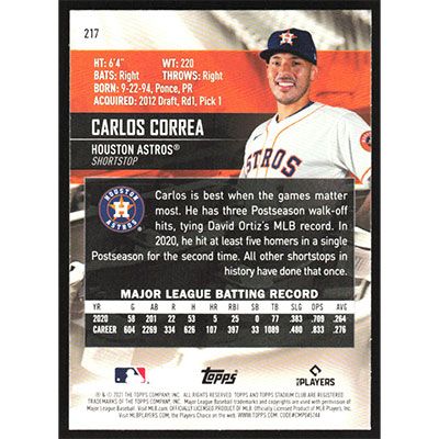 This is a 2021 Stadium Club Carlos Correa baseball card. The card is #217 and pictures show condition.