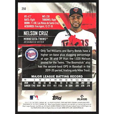 This is a 2021 Stadium Club Nelson Cruz baseball card. The card is #250 and pictures show condition.