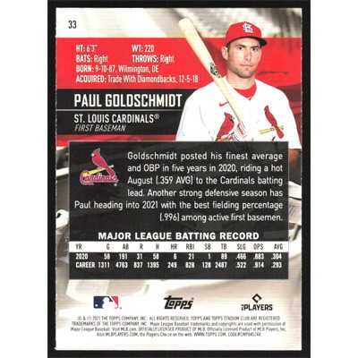 This is a 2021 Stadium Club Paul Goldschmidt baseball card. The card is #33 and pictures show condition.