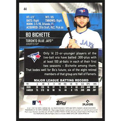 This is a 2021 Stadium Club Bo Bichette baseball card. The card is #44 and pictures show condition.
